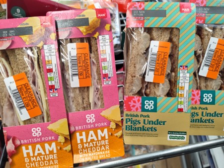 写真は残念ながら用意できなかったですが、Lidlは7時半以降に行くと値引きされている商品が多くあるのでおすすめです。ですが、あまり遅い時間に訪れると品薄になる場合が多いので、7時半から8時過ぎの間にいつも買い物をするようにしています。Lidlで特徴的なのはアプリに登録すると通常の値段よりも安く買える商品が多くあり、私はいつも4つ購入すると0.76£安くなる(一つ当たり0.5£)クロワッサンをまとめて購入するようにしています。